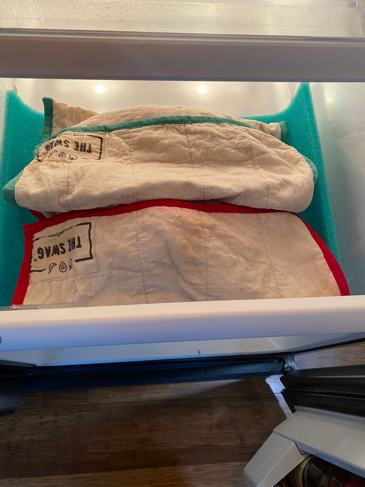 ** If you’re unable to put your Swag into a crisper, the Swags can happily be stored on your fridge shelves. However, you'll just have to dampen them a lot more, and more frequently as they tend to dry out faster when not in the crisper (where the humidity is better controlled). Whenever you open the fridge, check your Swags and if they are dry, run them under the tap so they are damp.